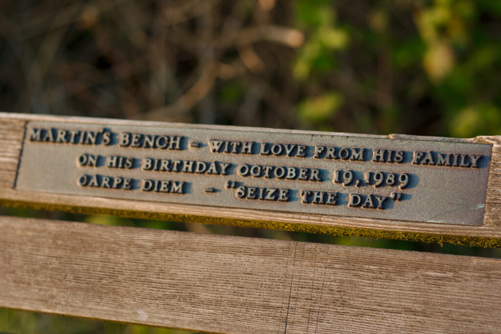 Close-up of a commemorative plaque on a bench in Stanley Park, reading 'Martin’s Bench – With Love on his Birthday October 19, Carpe Diem', with the sunlight softly highlighting the text.